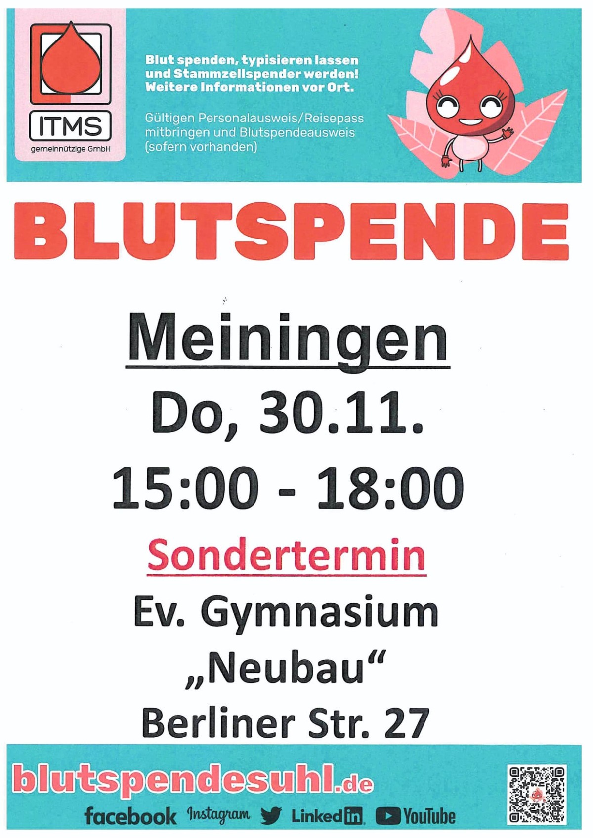 Am 30.11.2023 in der Zeit von 15 bis 18 Uhr findet die alljährliche Blutspende-Aktion, durchgeführt von der ITM Suhl, am EvG statt.